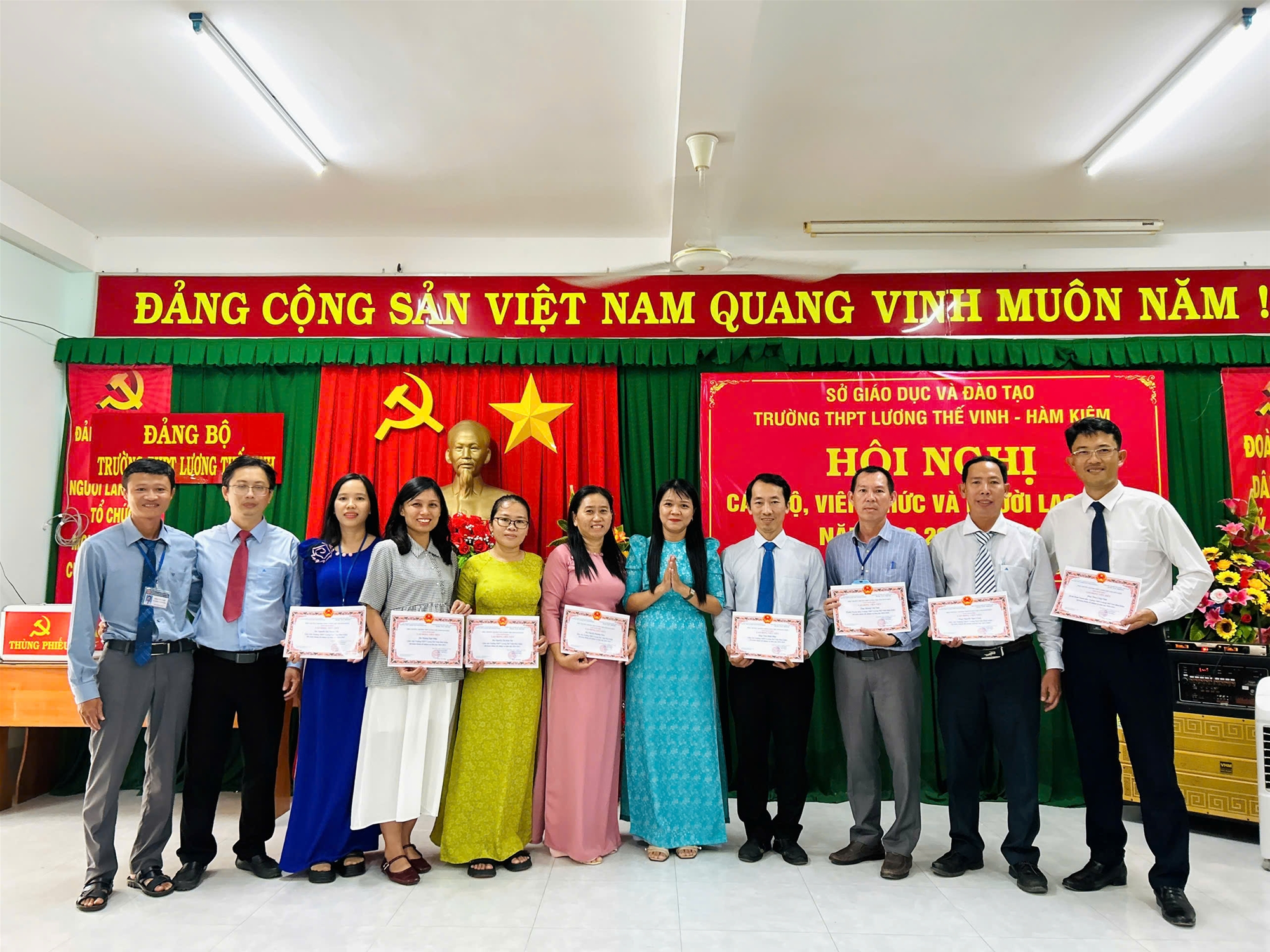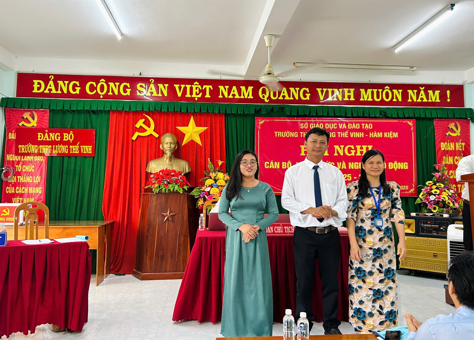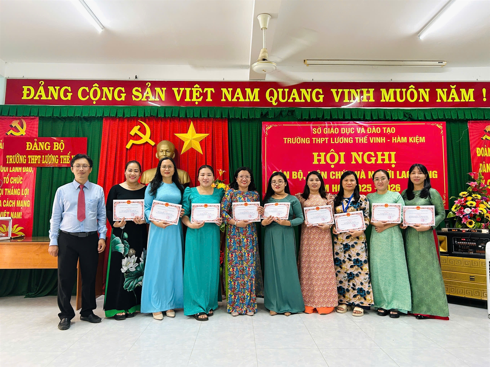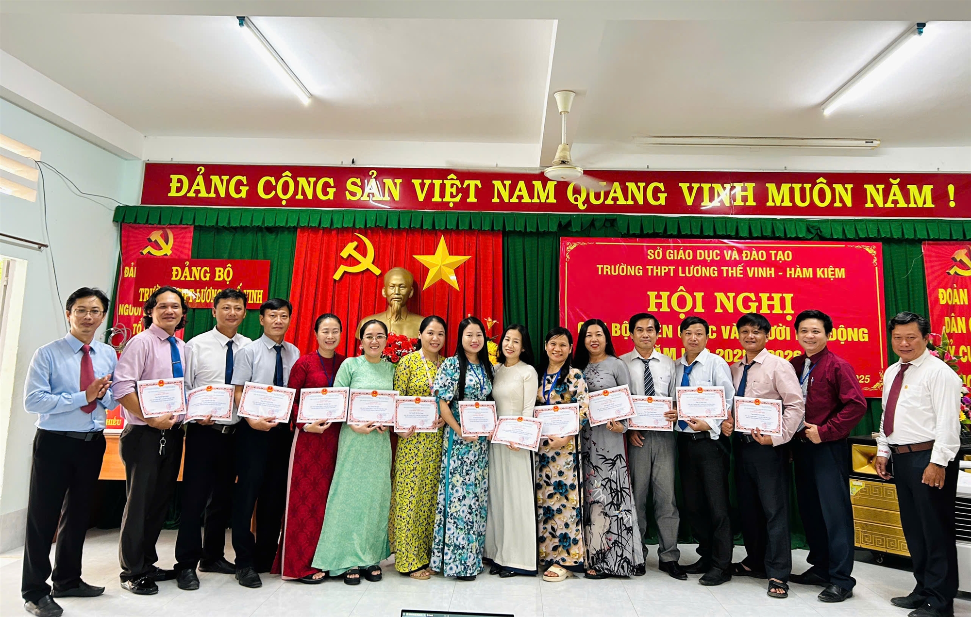 Chiều ngày 27/9/2025, Trường THPT Lương Thế Vinh – Hàm Kiệm đã long trọng tổ chức Hội nghị Cán bộ – Viên chức – Người lao động năm học 2025-2026. Hội nghị có sự tham dự của toàn thể cán bộ, giáo viên, nhân viên nhà trường trong không khí trang trọng, dân chủ và đoàn kết. Đây là dịp quan trọng để tập thể sư phạm nhìn lại kết quả đạt được trong năm học vừa qua, thẳng thắn chỉ ra hạn chế, đồng thời thống nhất phương hướng, nhiệm vụ và các chỉ tiêu cụ thể cho năm học mới.