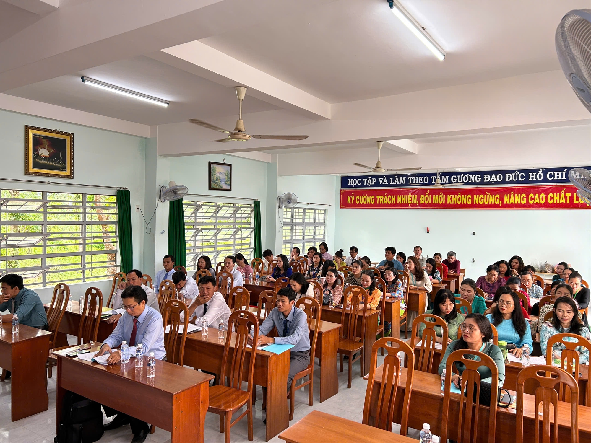 Sau phần thảo luận sôi nổi và dân chủ, Hội nghị đã thống nhất phương hướng, mục tiêu năm học 2025-2026, đồng thời xác định chủ đề năm học là: “Kỷ cương – Sáng tạo – Đột phá – Phát triển”. Trọng tâm là tiếp tục nâng cao chất lượng giáo dục toàn diện; đẩy mạnh ứng dụng công nghệ số trong dạy học và quản lý; chú trọng giáo dục phẩm chất, kỹ năng sống cho học sinh; xây dựng môi trường học tập an toàn, thân thiện, kỷ cương và sáng tạo. Hội nghị cũng đã thống nhất kiện toàn Ban thanh tra nhân dân năm học 2025-2026 gồm có 03 thầy, cô: Thầy Nguyễn Văn Sơn (trưởng ban), cô Trương Thị Diễm My và cô Đỗ Thị Kim Nga (thành viên).