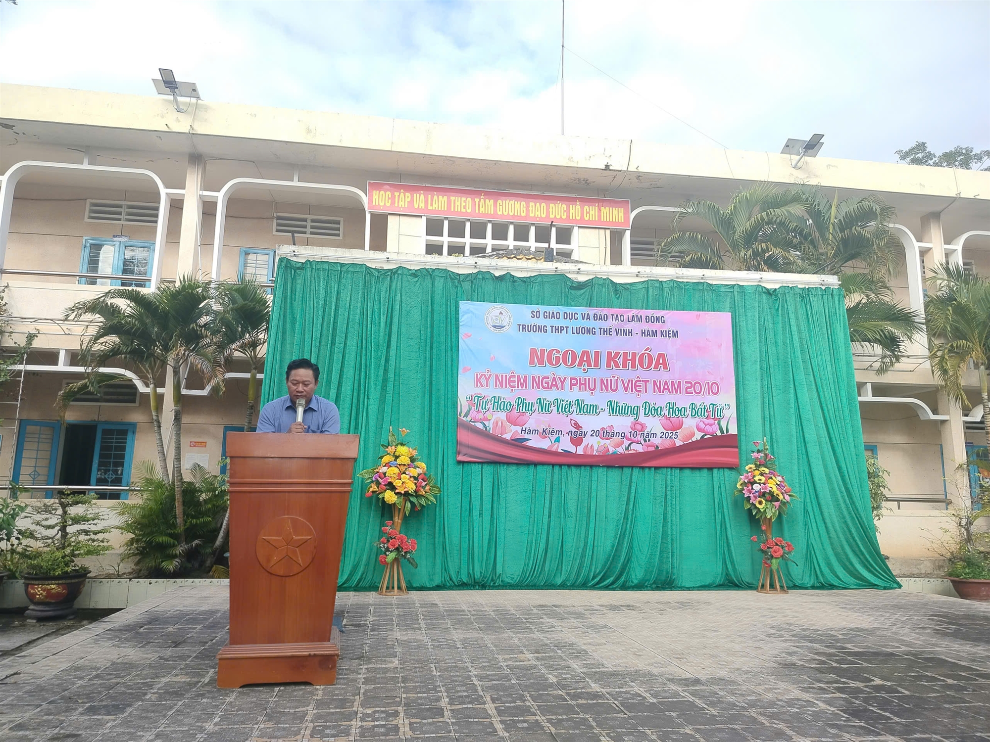 Trong không khí trang trọng và ấm áp, thầy Phạm Thi Nhân - bí thư Đảng ủy - Hiệu trưởng nhà trường, đại diện quý thầy giáo trong nhà trường, đã có lời phát biểu chúc mừng và tặng hoa đến toàn thể nữ cán bộ, giáo viên, nhân viên và học sinh nữ – những “đóa hoa tươi thắm” của ngôi trường THPT Lương Thế Vinh – Hàm Kiệm, đang ngày đêm cống hiến cho sự nghiệp giáo dục và làm đẹp thêm cho cuộc sống.