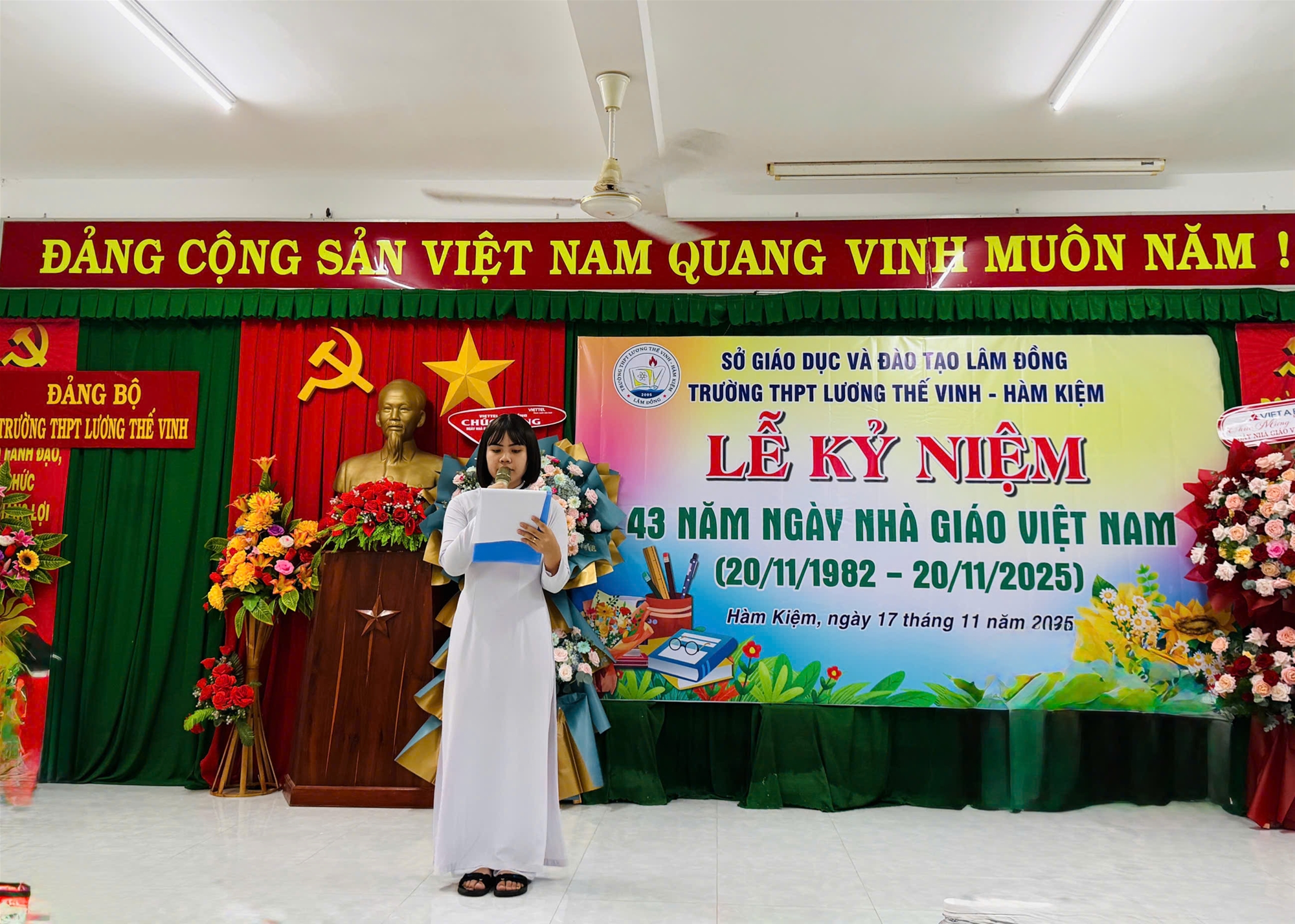 Một trong những khoảnh khắc chạm đến trái tim thầy cô nhất chính là Thư tri ân do em Kim Ngân, học sinh 12A2 đại diện toàn trường gửi đến Thầy cô giáo. Giọng đọc còn có lúc ngập ngừng nhưng đầy cảm xúc đã gợi lại biết bao kỷ niệm: "những buổi sửa bài muộn, những lần thầy cô lặng lẽ động viên, những bài học không chỉ trong sách vở mà còn trong cách sống, cách làm người"
