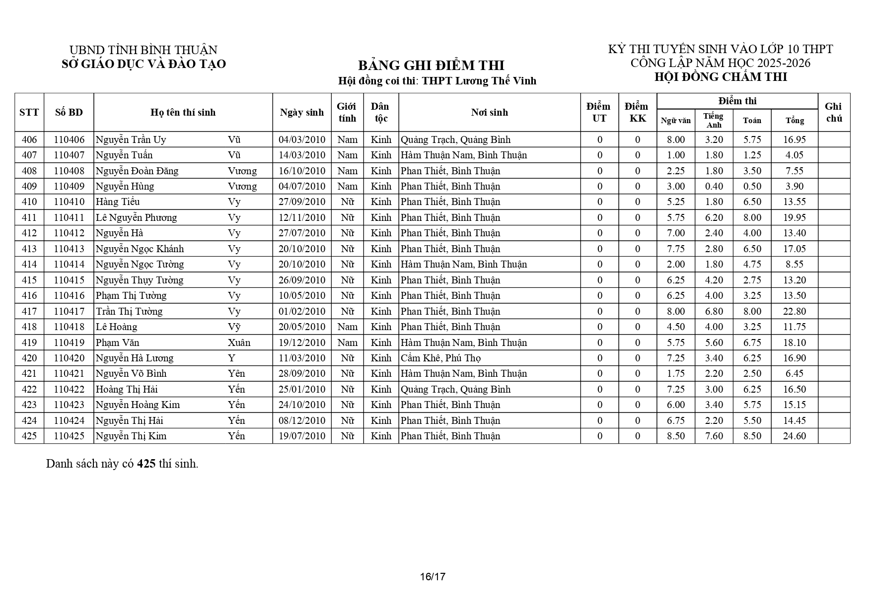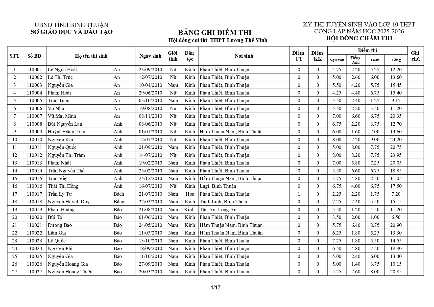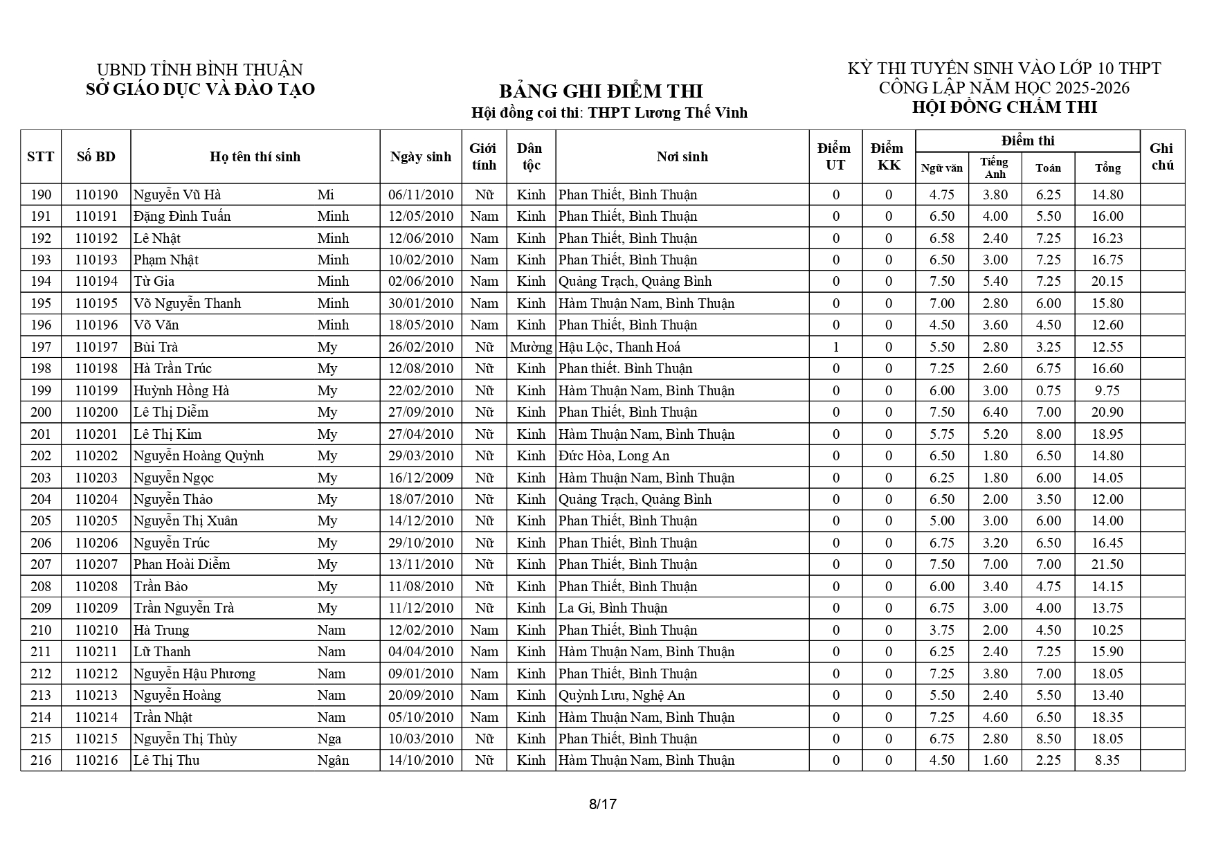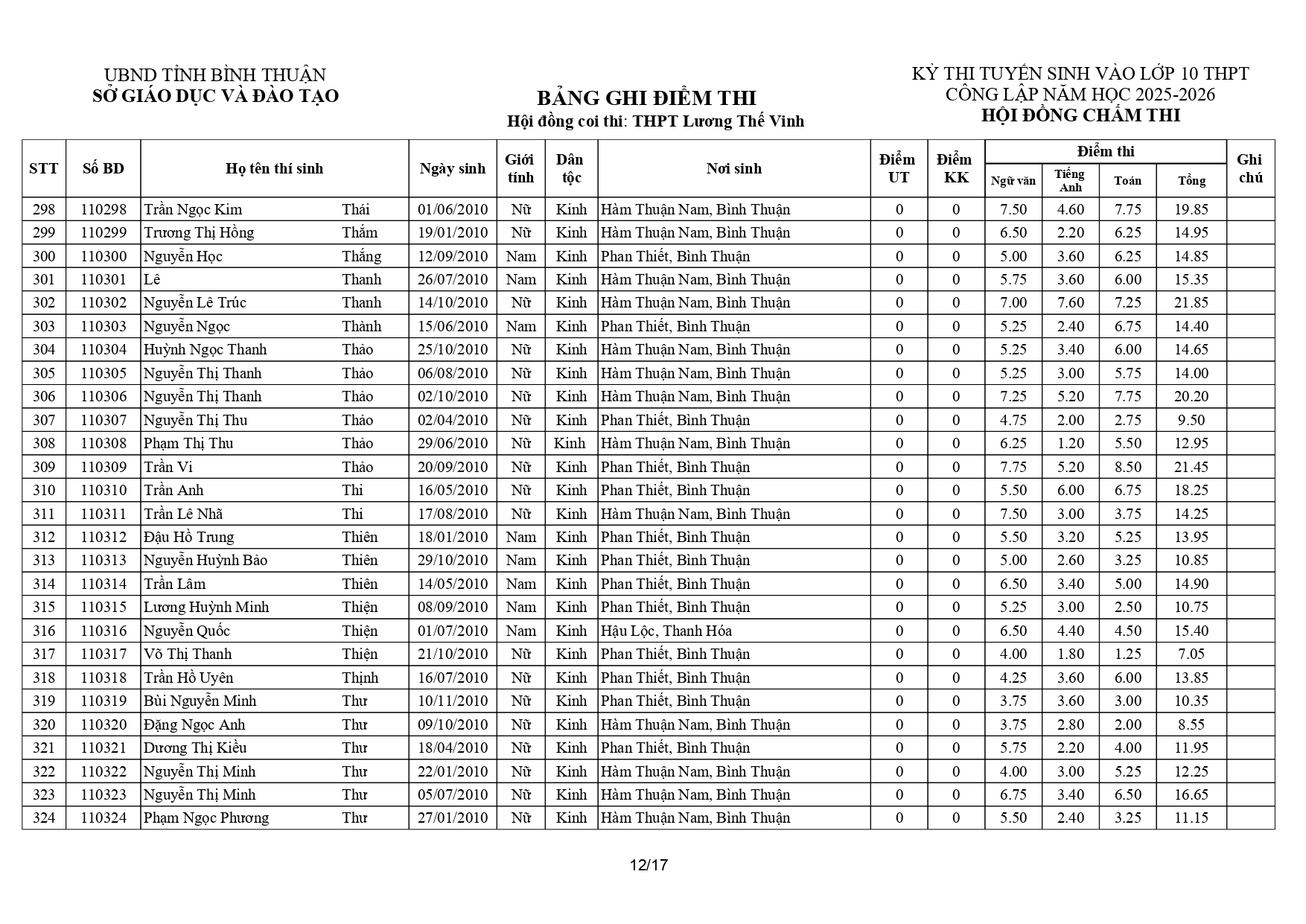 THÔNG BÁO: ĐIỂM THI KỲ THI TUYỂN SINH VÀO LỚP 10 THPT, NĂM HỌC 2025-2026, TRƯỜNG THPT LƯƠNG THẾ VINH