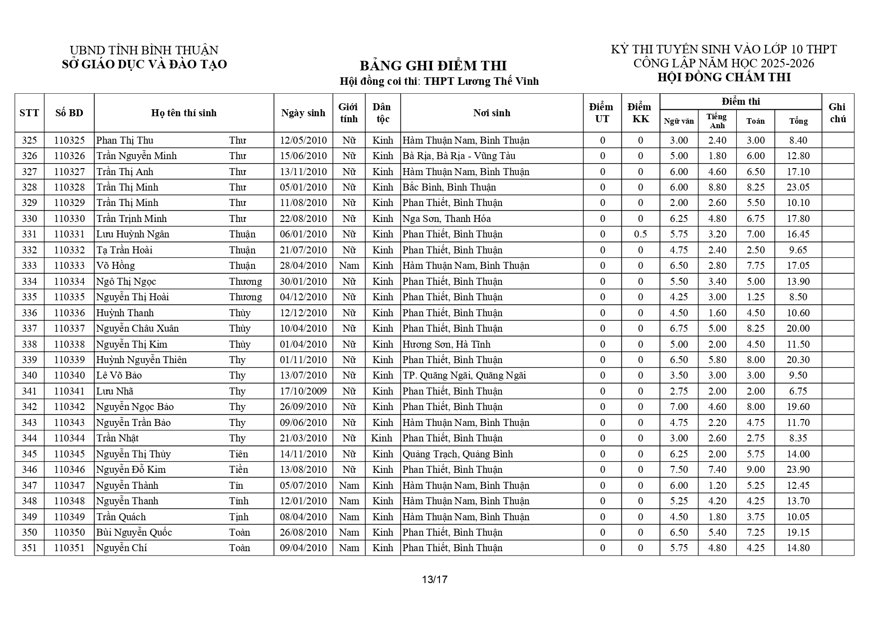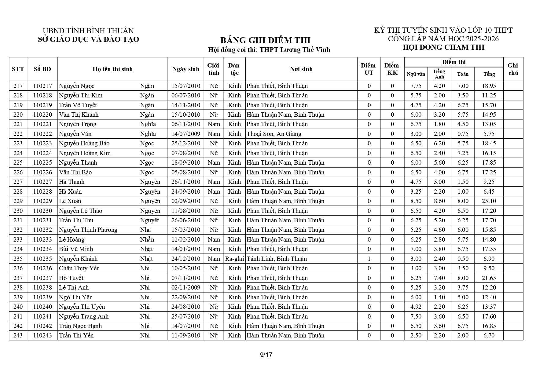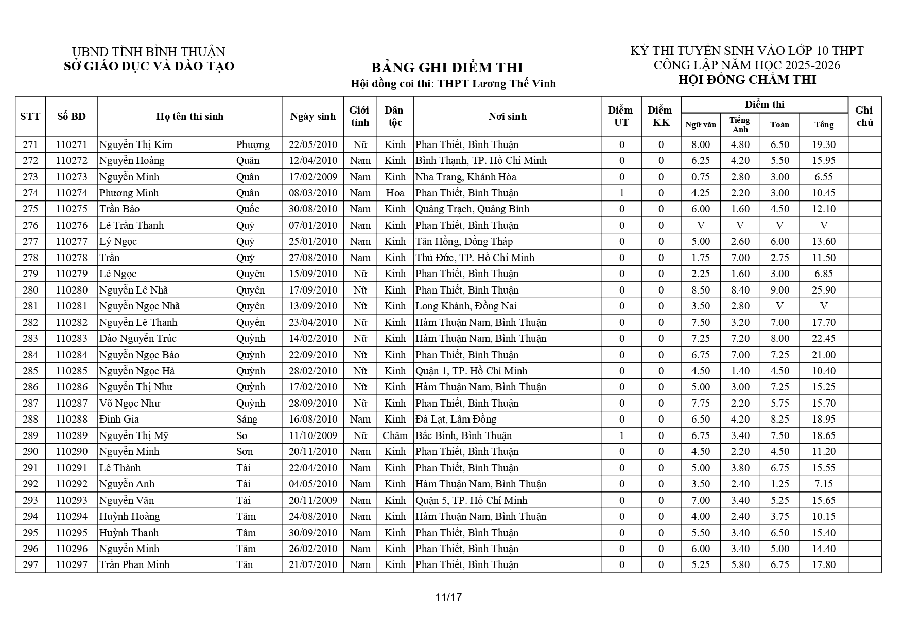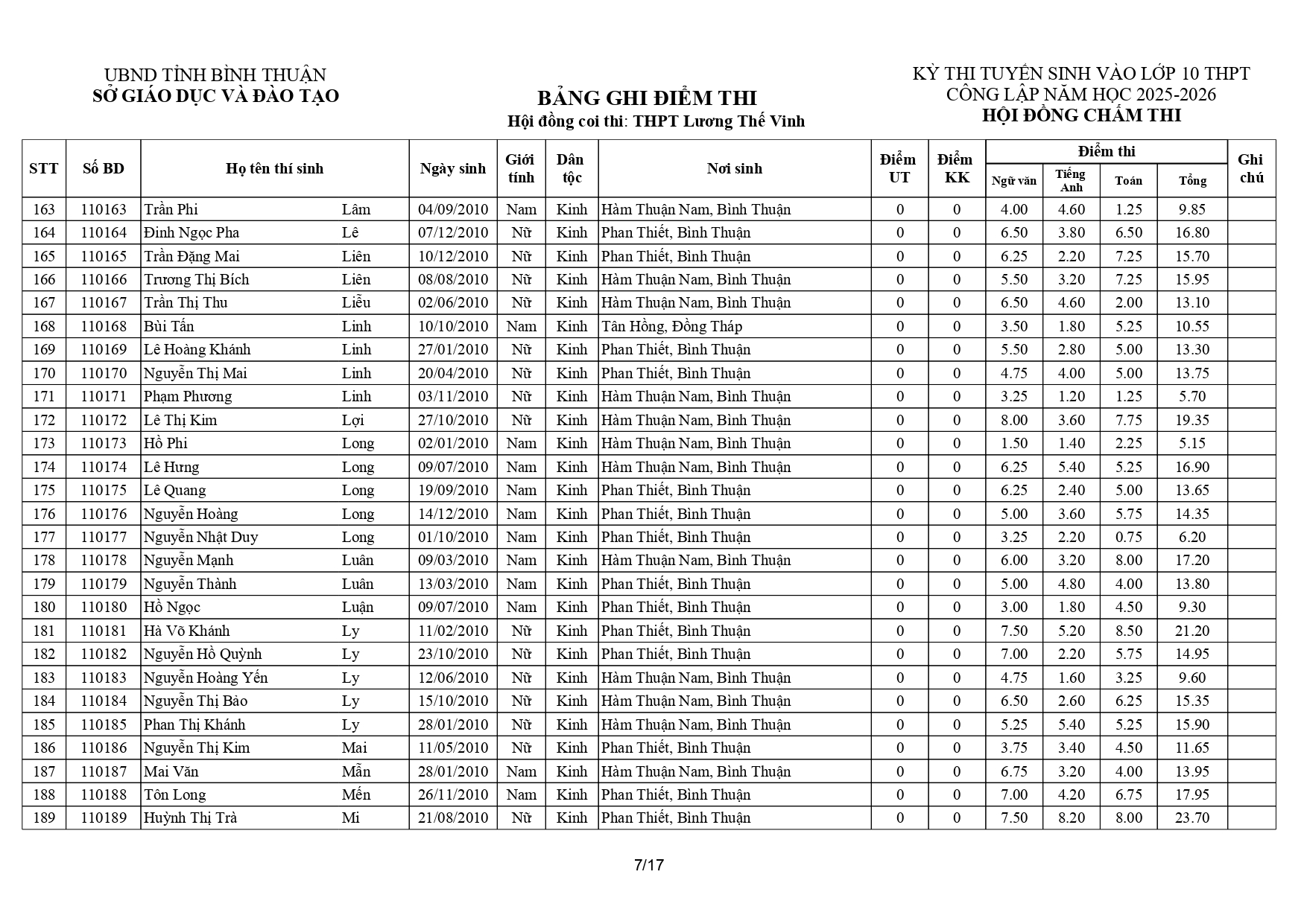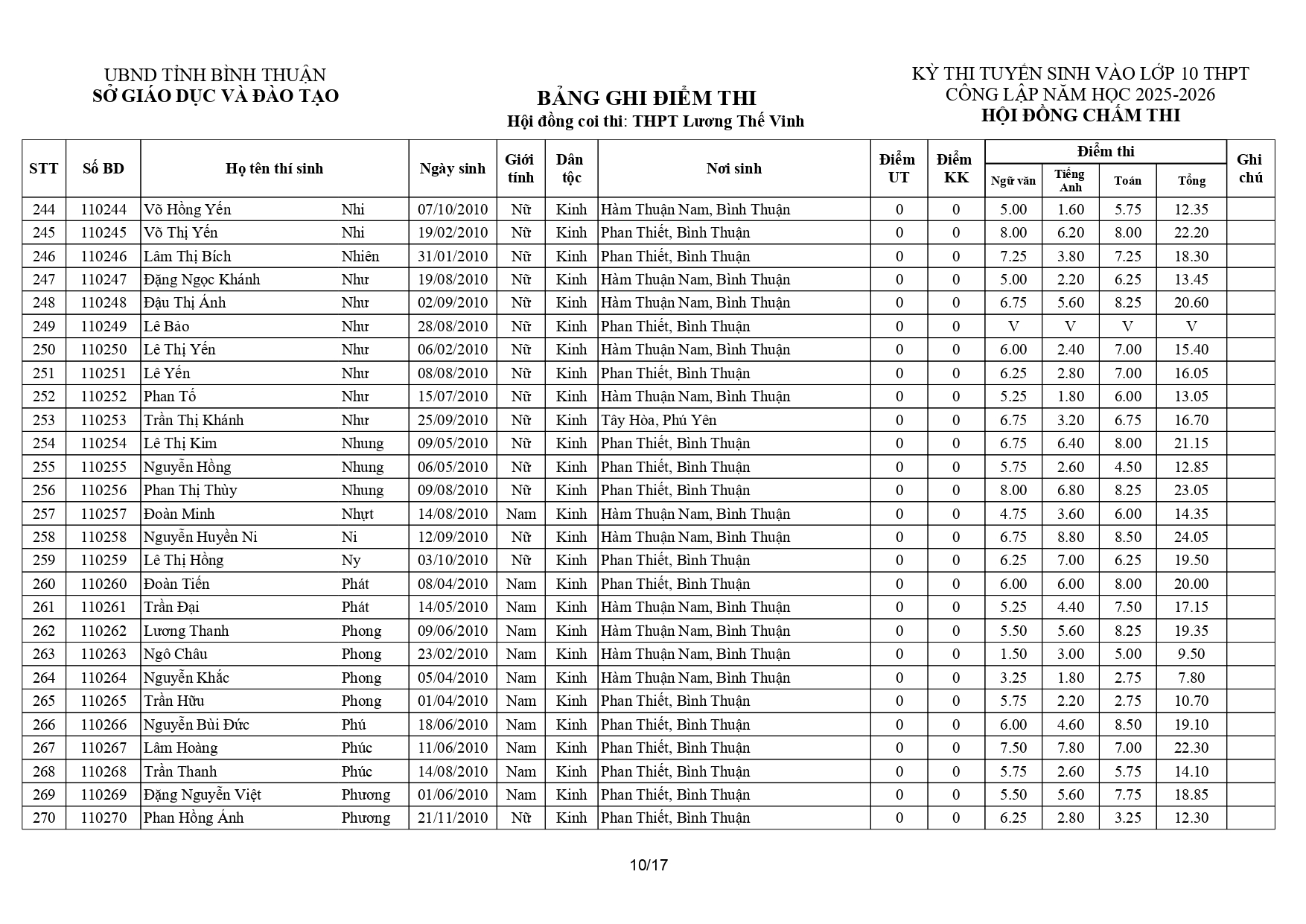 THÔNG BÁO: ĐIỂM THI KỲ THI TUYỂN SINH VÀO LỚP 10 THPT, NĂM HỌC 2025-2026, TRƯỜNG THPT LƯƠNG THẾ VINH