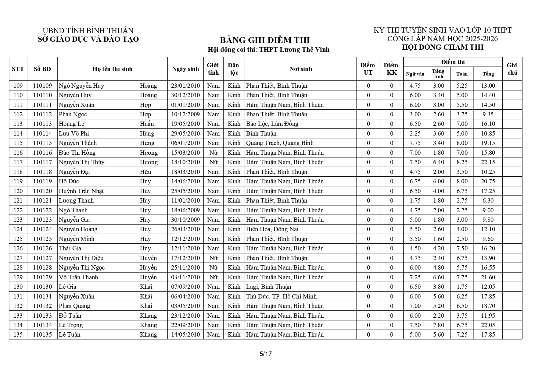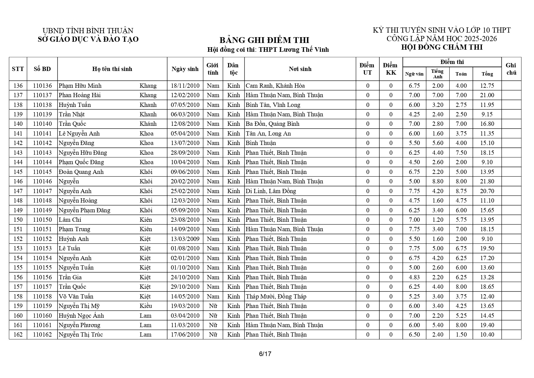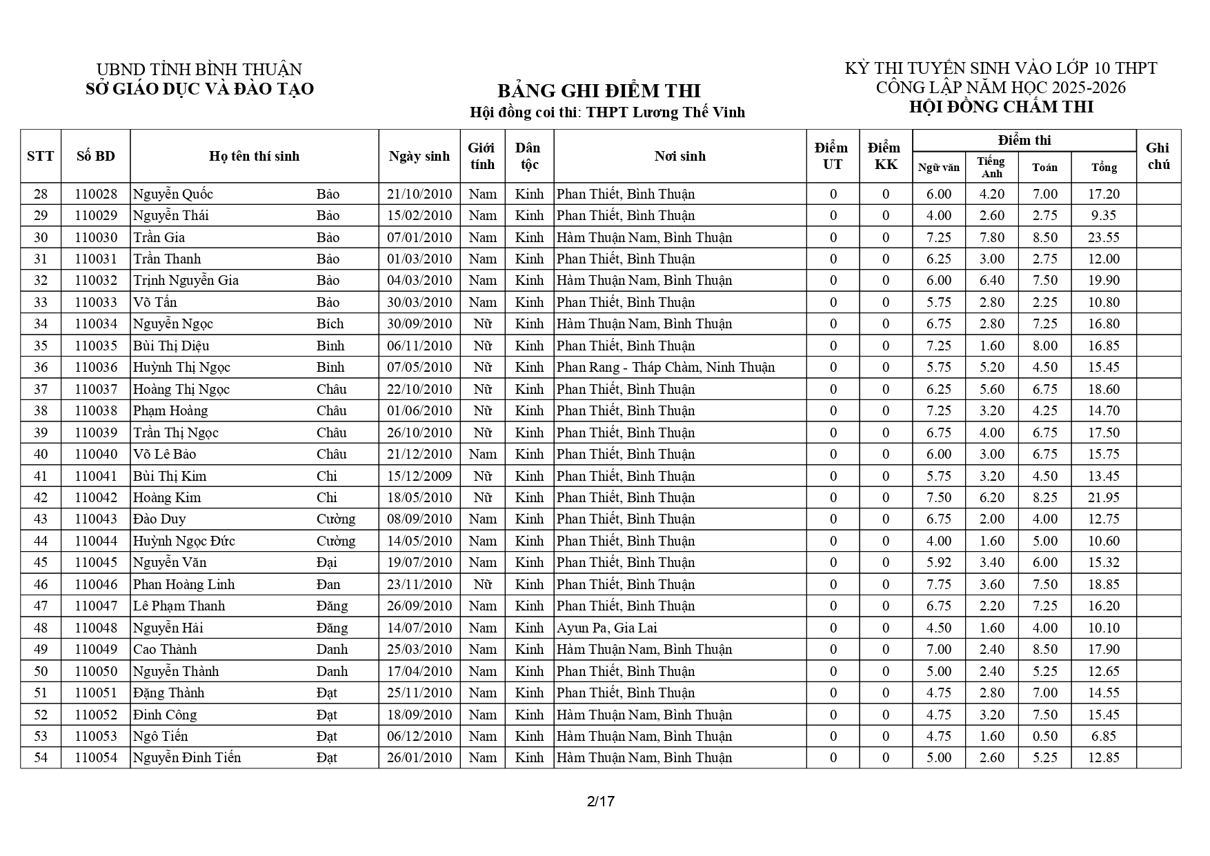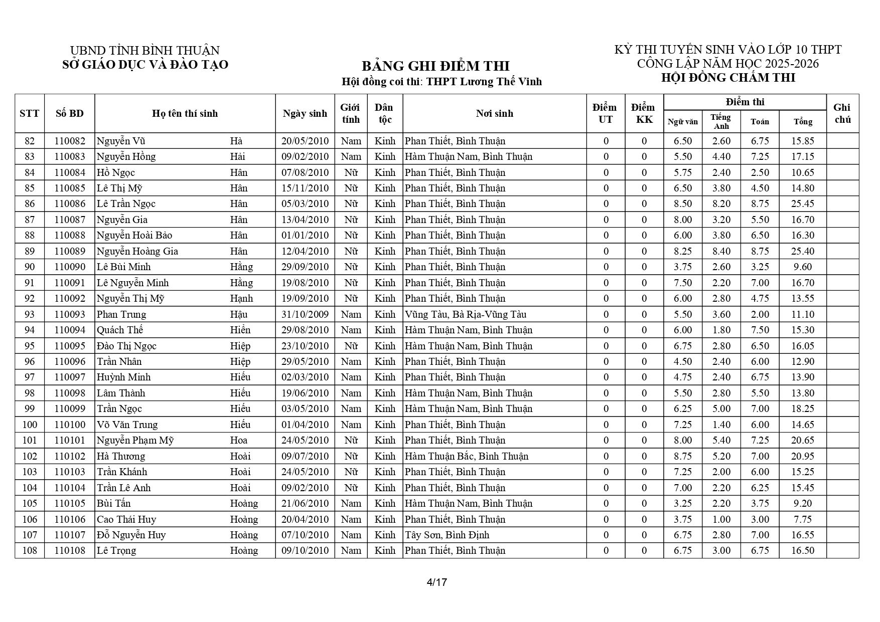 THÔNG BÁO: ĐIỂM THI KỲ THI TUYỂN SINH VÀO LỚP 10 THPT, NĂM HỌC 2025-2026, TRƯỜNG THPT LƯƠNG THẾ VINH